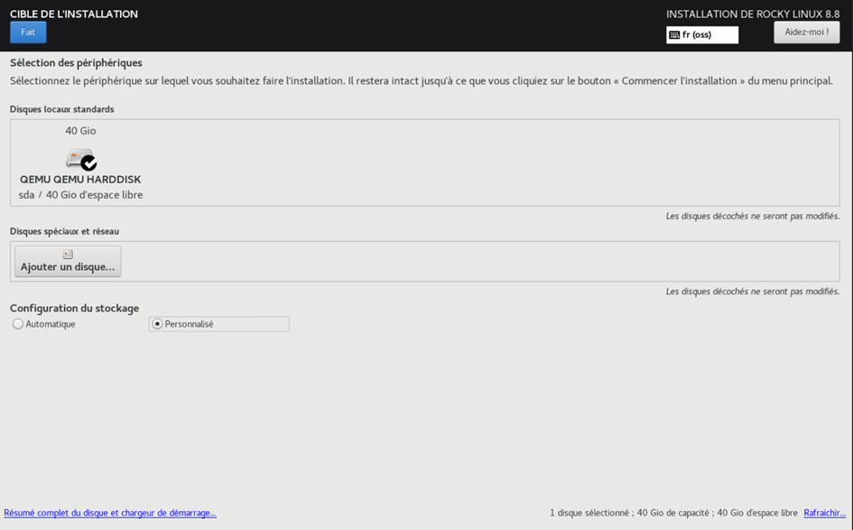- Cocher l’option « Personnalisé » dans la configuration du stockage puis le bouton « Fait » en haut à gauche